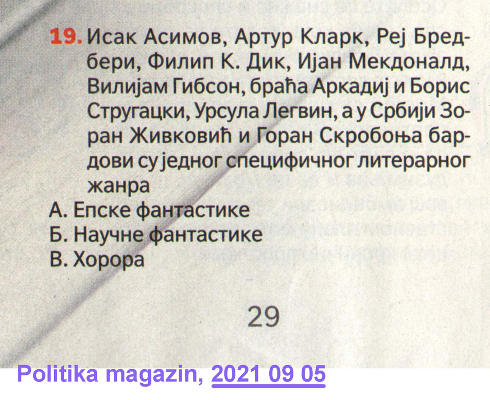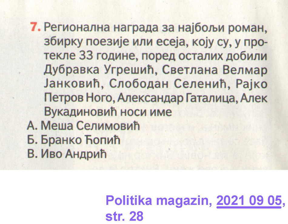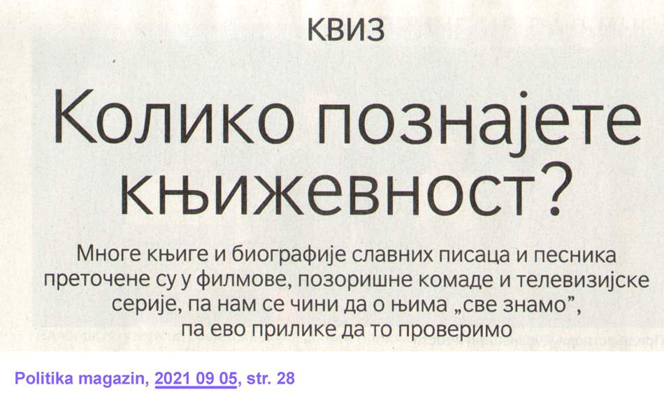 данас (требало је раније да јавимо... док су киосци били отворени... пардон) у „Политици“ имате уметнут магазин, а у њему на стр. 28 и 29 је квиз о књижевности: