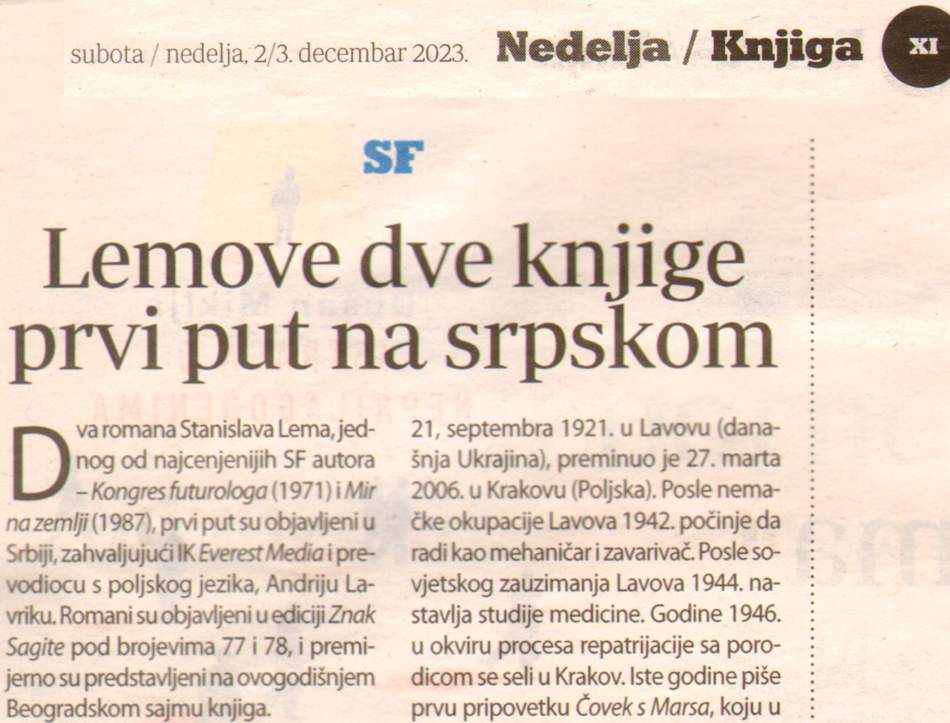 у данашњем и сутрашњем „Данасу“, на стр. XI културног додатка, имате чланак, наднаслов је “СФ“, наслов је „Лемове две књиге први пут на српском“, потписује Д.С, те две књиге су Конгрес футуролога и Мир на Земљи, и, ако смо добро схватили, у обе је протагониста Ијон Тихи. Преводилац је Андреј Лаврек. Издавач је Бобанов „Еверест медија“, у едицији „Знак сагите“.