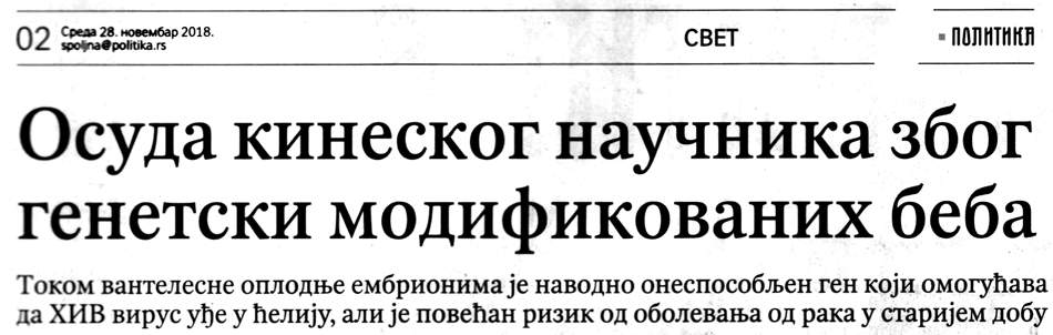 (2)  Данас у “Политици” на стр. 2 (дакле, на веома истакнутом, важном месту) велики чланак о наводној генетској модификацији те две бебе у Кини: