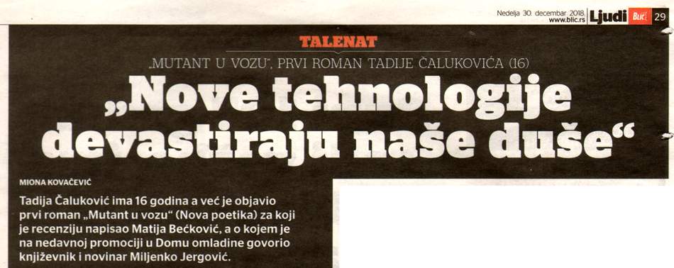 (2)  Данас, у недељу 30. децембра, у “Блицу”, целу стр. 29 заузима само један чланак, о књизи Мутант у возу Тадије Чалуковића. Чланак потписује Миона Ковачевић.