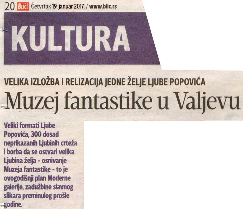 (2)  Такође у данашњем “Блицу” али на следећој страници (дакле, на стр. 23) имате чланак о настојањима да се у Ваљеву направи Музеј фантастике, у складу са заветом једног истакнутог сликара, Љубомира-Љубе Поповића (1934-2016). Евидентно се мисли понајпре на дела наших сликара надреалиста, нарочито Оље Ивањицки. То је изгледа врло близу одлуке да се крене у остваривање. Могло би да се претвори у значајну туристичку дестинацију.