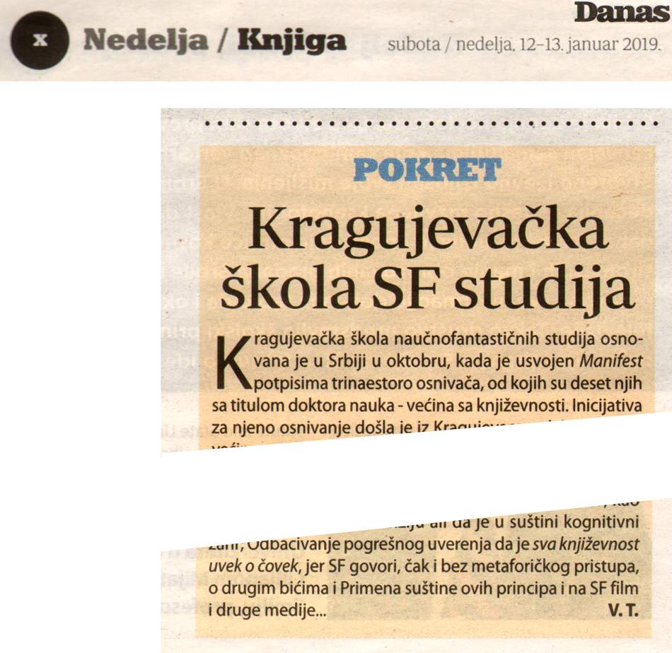 Основана је Крагујевачка школа научнофантастичних студија, она има и свој Манифест, који је потписало 13 оснивача, који су већином доктори наука.