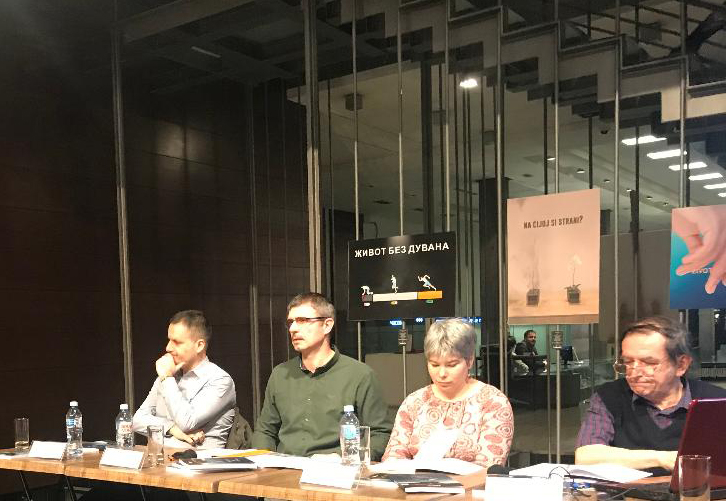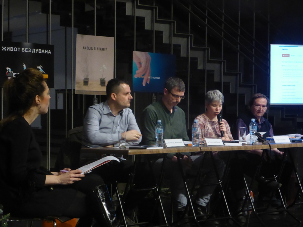 и, сасвим десно, поред ТВ екрана, проф. (сада у пензији) др Александар Б. Недељковић, енглеска књижевност, Филолошко-уметнички факултет Универзитета у Крагујевцу. На следећој слици видимо модераторку (лево) и свих четворо учесника:
